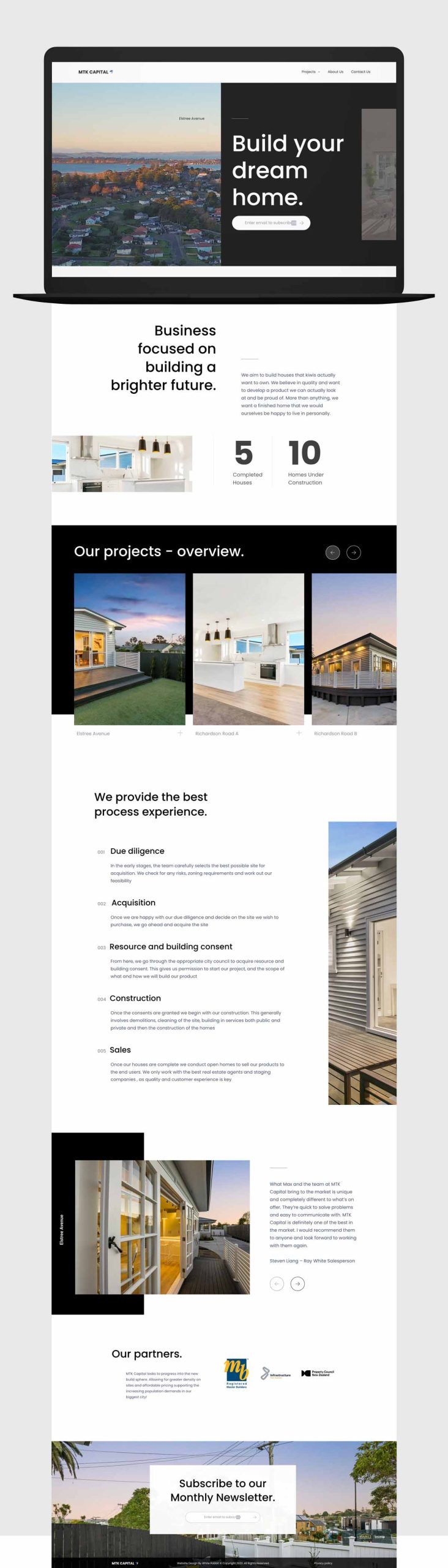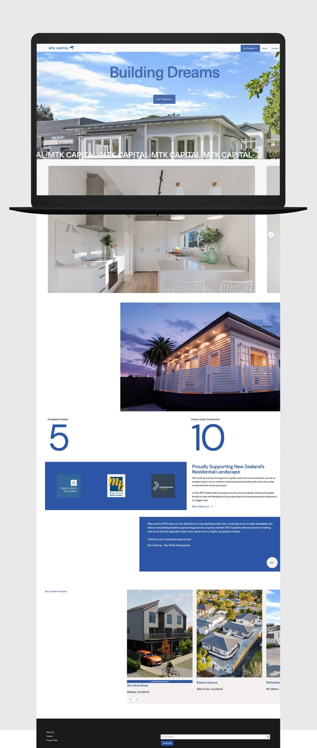 MTK Capital, a Kiwi business dedicated to building high-quality homes, needed a refreshed website that better reflected their values and showcased their work. The new design features a contemporary layout, clear typography, a video hero section, subtle animations, and a photography-focused project slider to create engagement. The result is a modern property website that highlights their craftsmanship and leaves a strong professional impression.