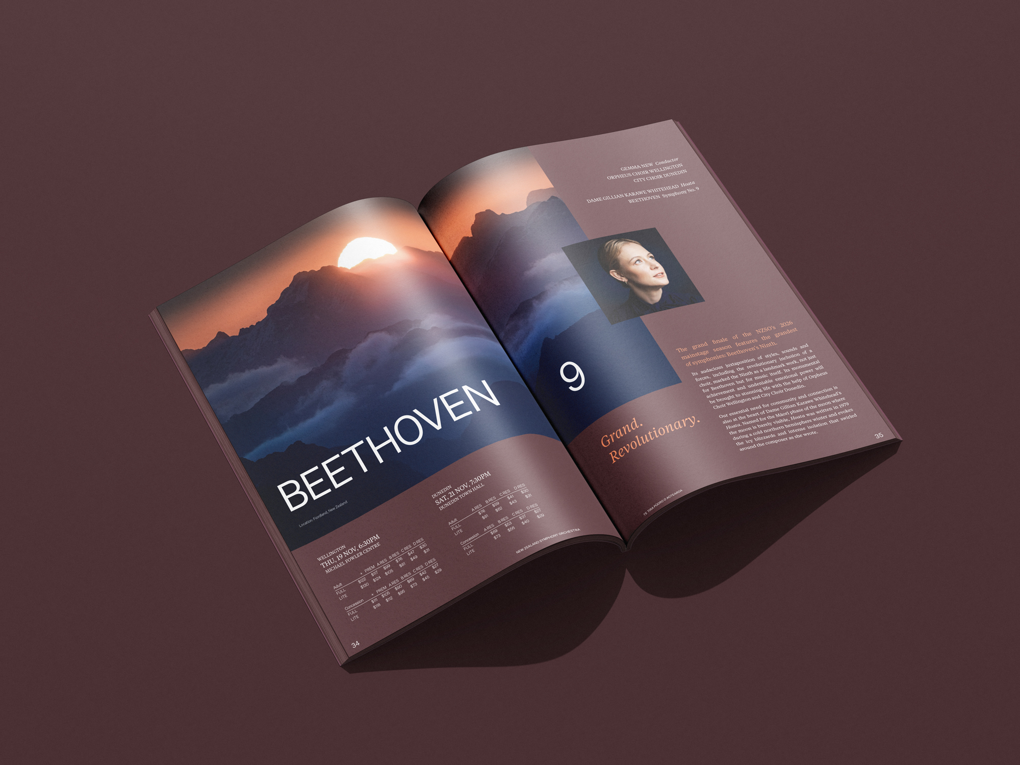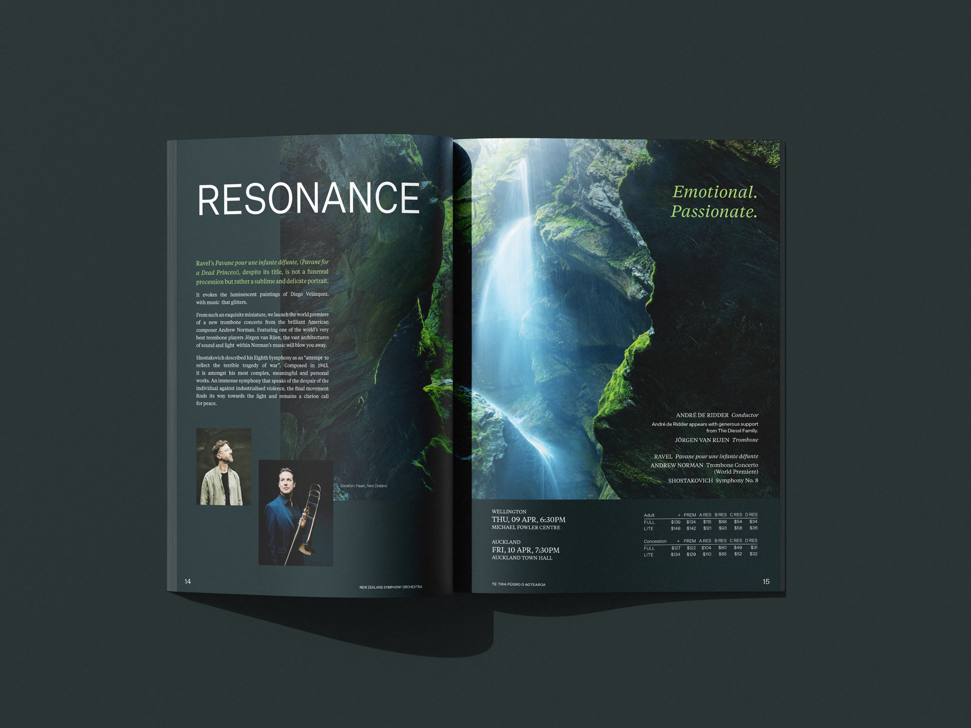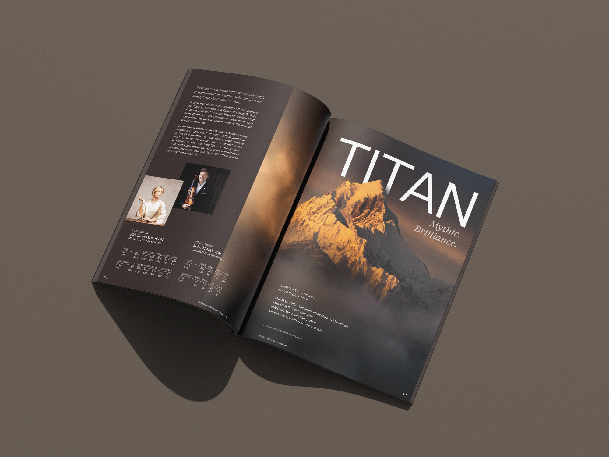 The New Zealand Symphony Orchestra is Aotearoa’s national orchestra known for world-class performances and rich cultural storytelling. The 2026 Season Brochure pairs each concert with a dynamic New Zealand landscape chosen to mirror the narrative, mood, and character of the musical piece. A cohesive visual system ties these scenes together, creating distinct yet connected pages. Each spread was carefully designed and rolled out to maintain consistency while giving every performance its own identity.